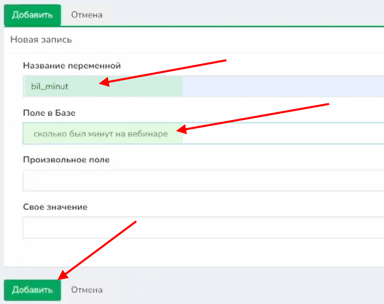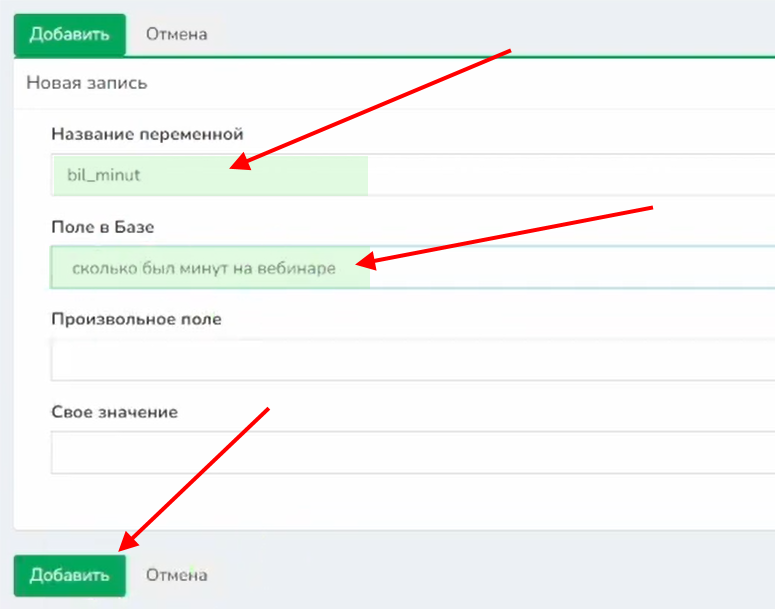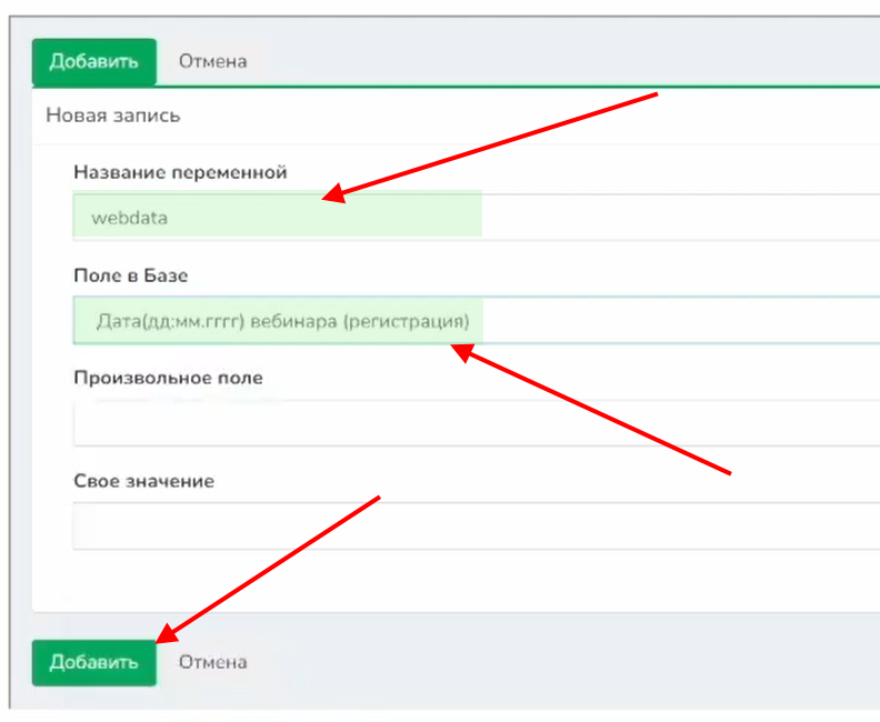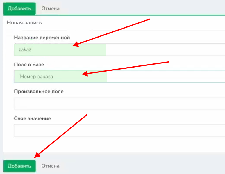 2 Введите название переменной латинскими буквами без пробелов и выберите нужное поле в базе. Нажмите на «Добавить»