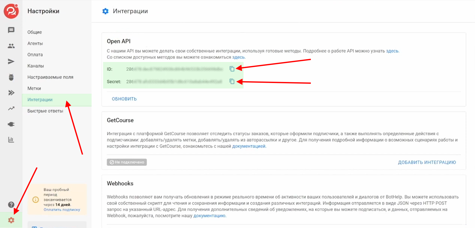 Перейдите на Bothelp. Внизу слева нажмите на «Настройки», далее выберите «Интеграции». Сгенерируйте в разделе «Open API» ключ, а затем скопируйте его и ID