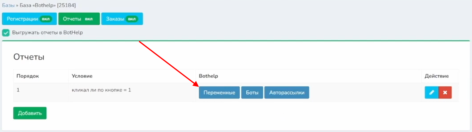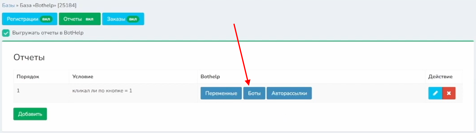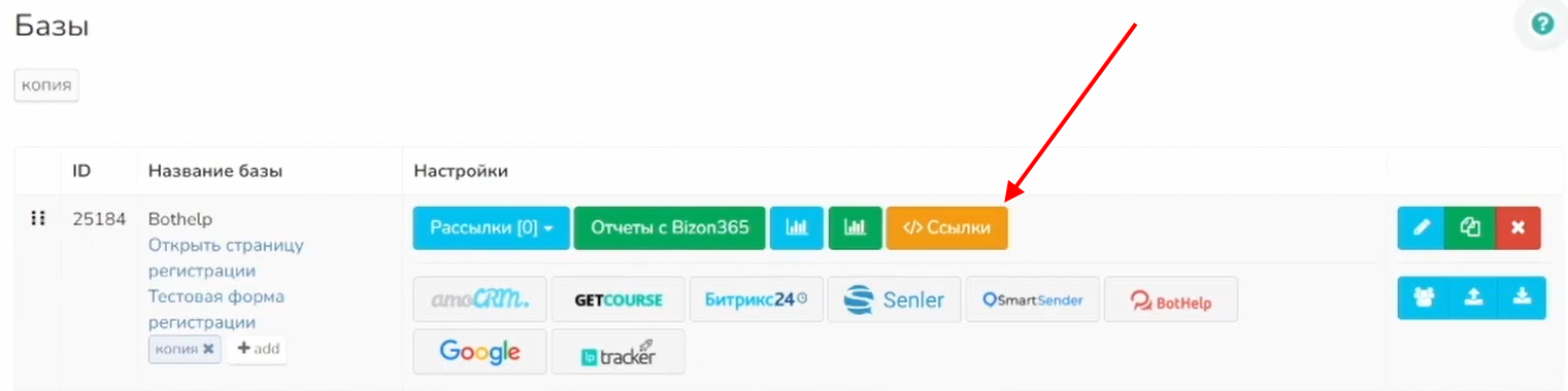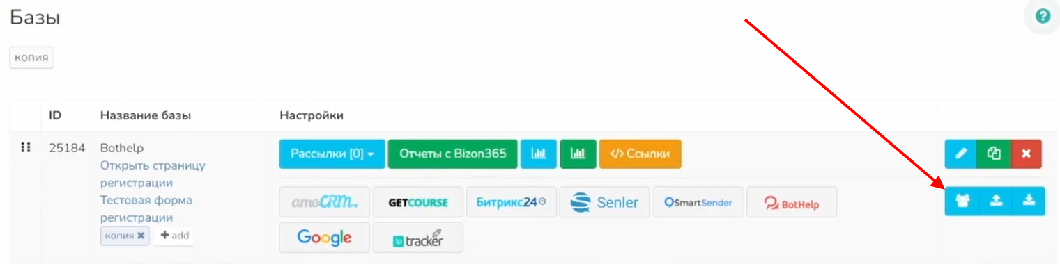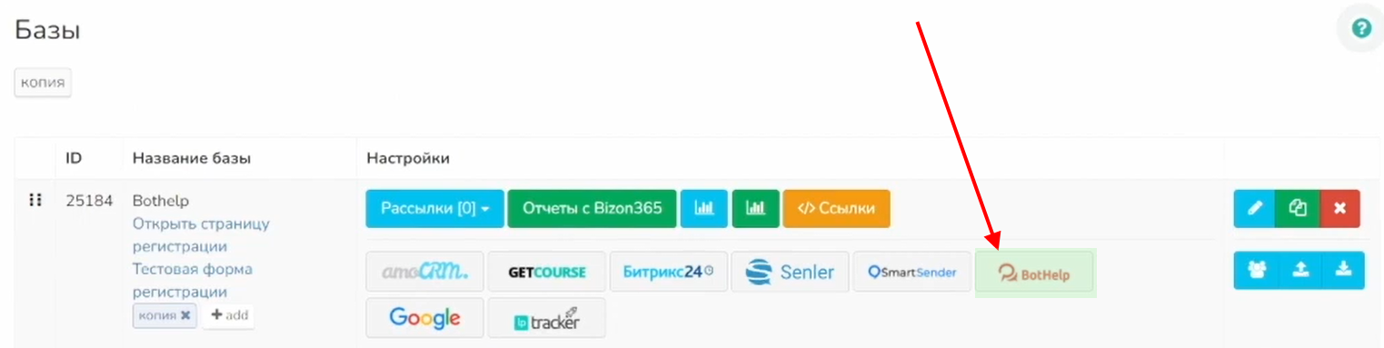 1 Вернитесь в меню «Базы». После подключения Bothelp в базе появилась кнопка сервиса. Нажмите на неё