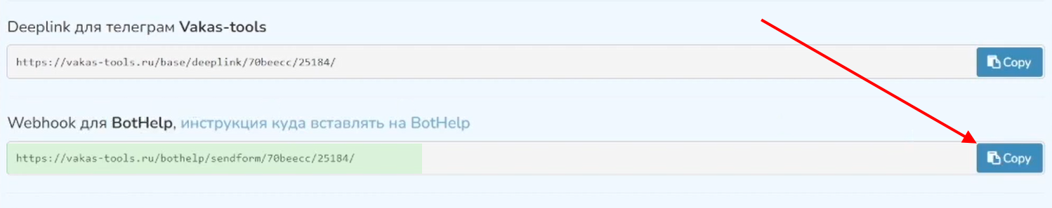 6 Спуститесь ниже и найдите «Webhook для Bothelp». Скопируйте его