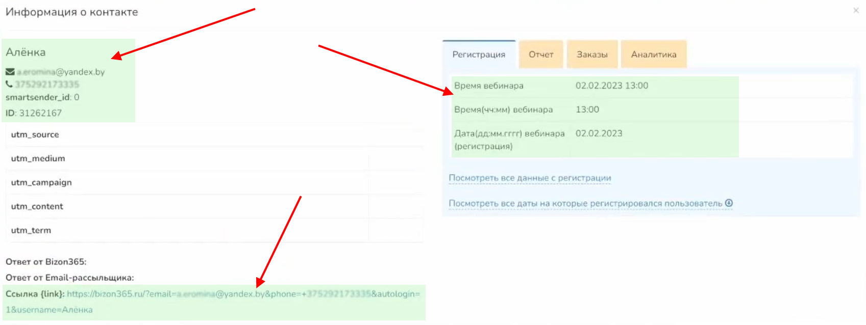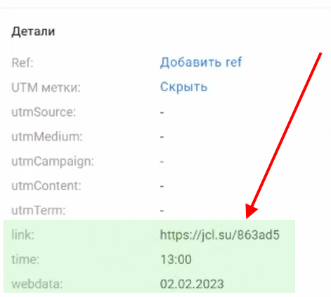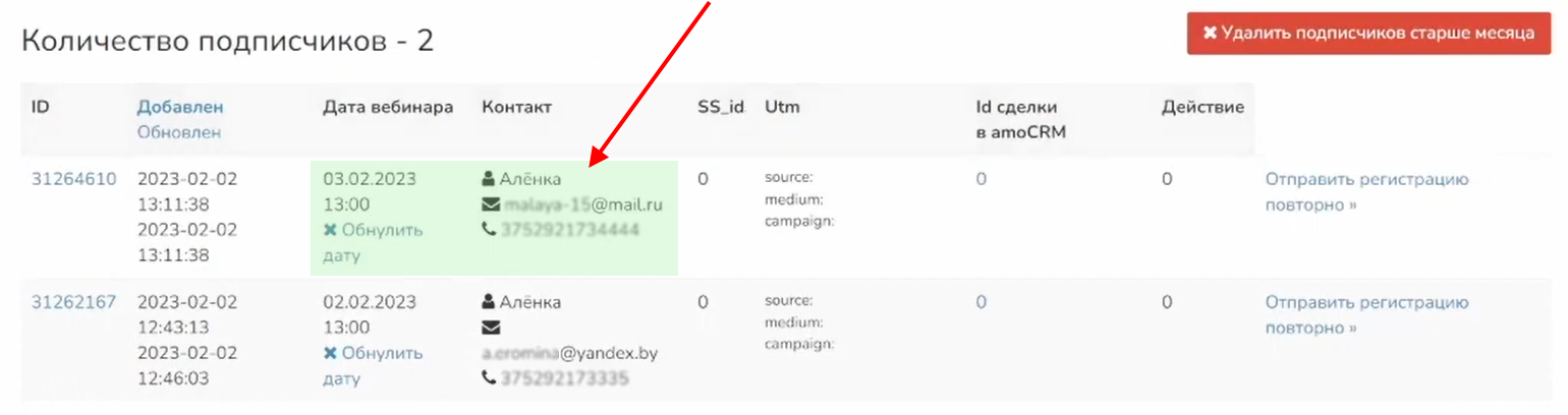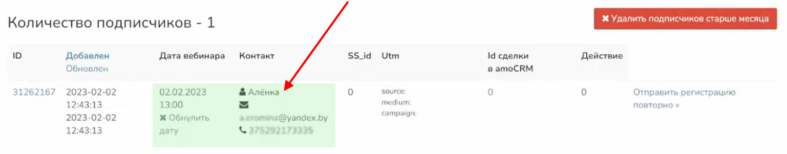 6 Пролистните страницу вниз и проверьте, что лид поступил в базу. У лида должны быть указаны ссылка на комнату и дата вебинара