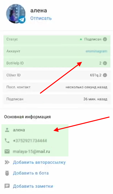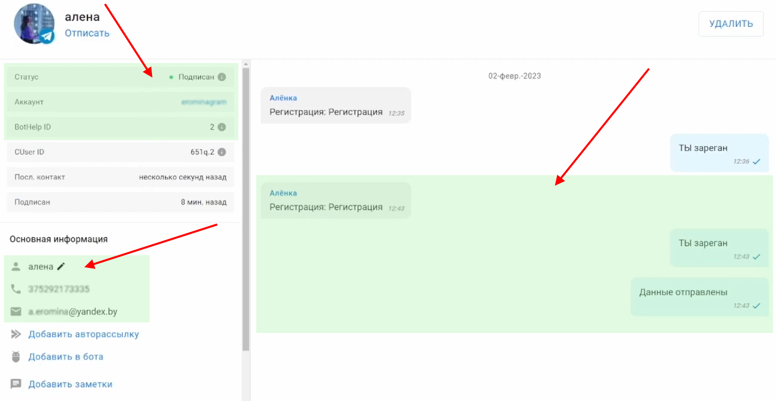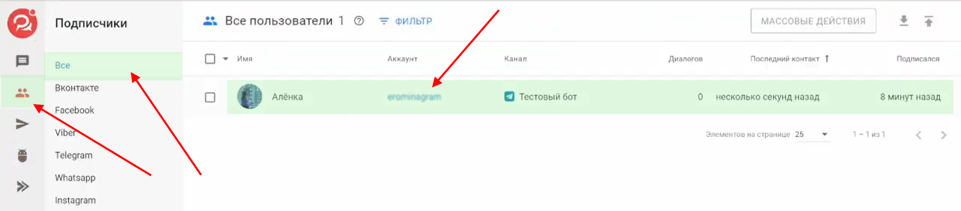 7 Перейдите на Bothelp и откройте «Подписчики». Проверьте наличие лида, его контактные данные, ссылку на вебинар и дату вебинара