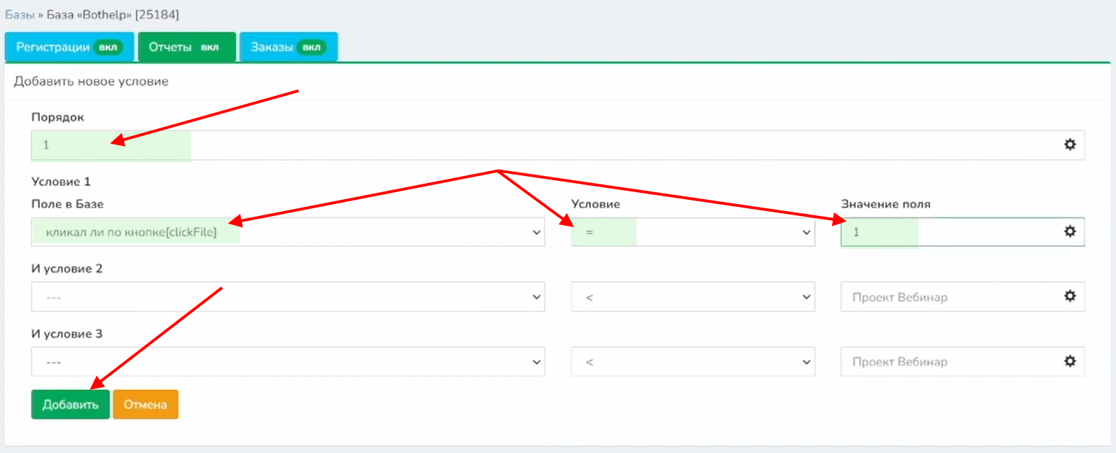 2 Добавьте первое условие. Поскольку важен порядок, устанавливаем цифру «1». Выберите поле «кликал ли по кнопке», условие «равно (=)» и значение поля «1». Нажмите на «Добавить»