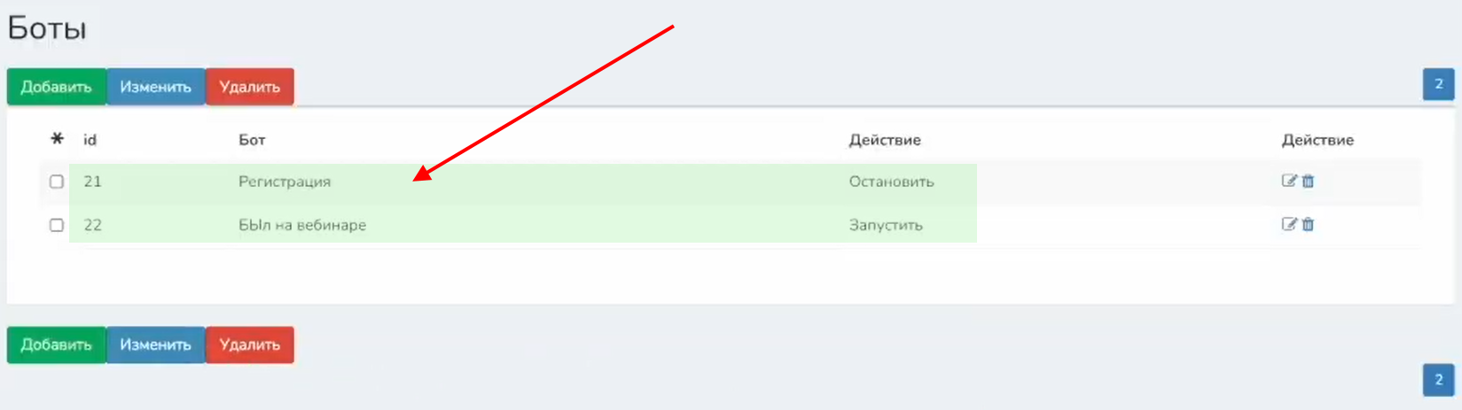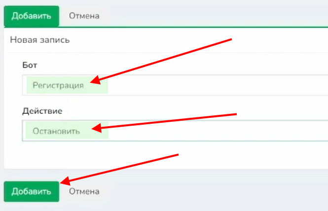 6 Выберите бота и действие, например, «Регистрация» и «Остановить»