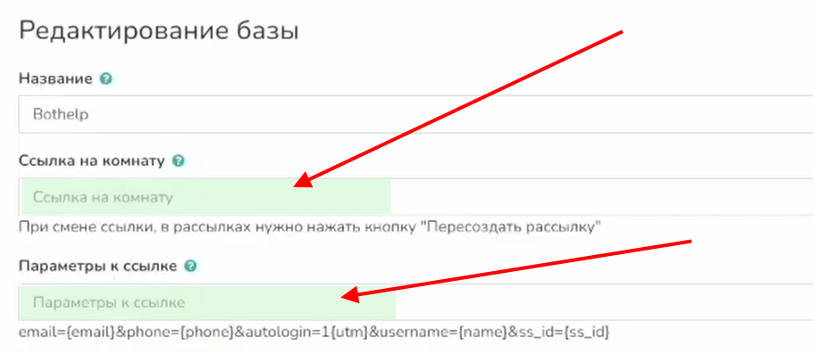 3 Если планируется направлять посредством бота ссылку на вебинар, проверяем, чтобы в настройках базы была указана ссылка на комнату