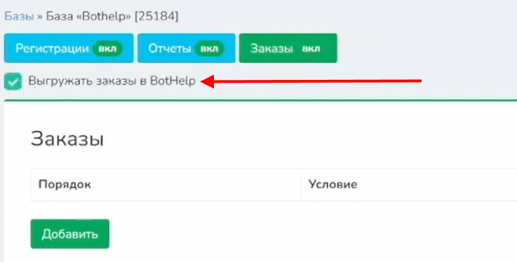 Перейдите в Vakas-tools, выберите вкладку «Заказы» и проставьте галочку «Выгружать заказы в Bothelp»
