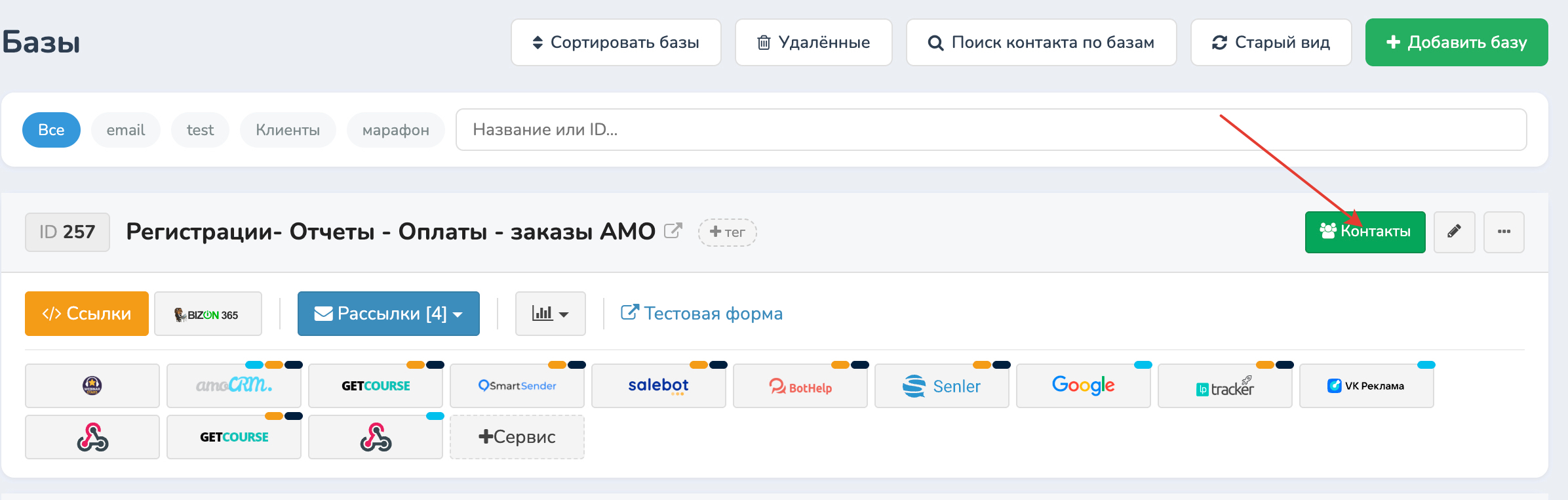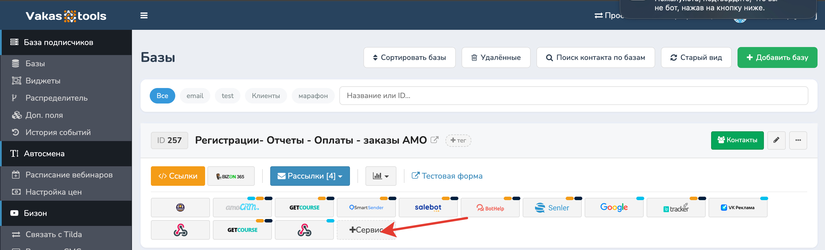 В базах добавьте сервис к базе кнопкой [+Сервис].