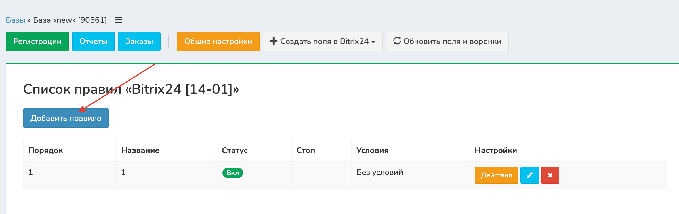 Передача данных настраивается через правила. На странице сервиса три вкладки: Регистрации, Отчёты, Заказы.