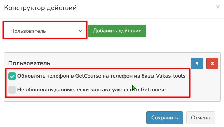 - Обновлять телефон — по умолчанию телефон устанавливается только при создании.