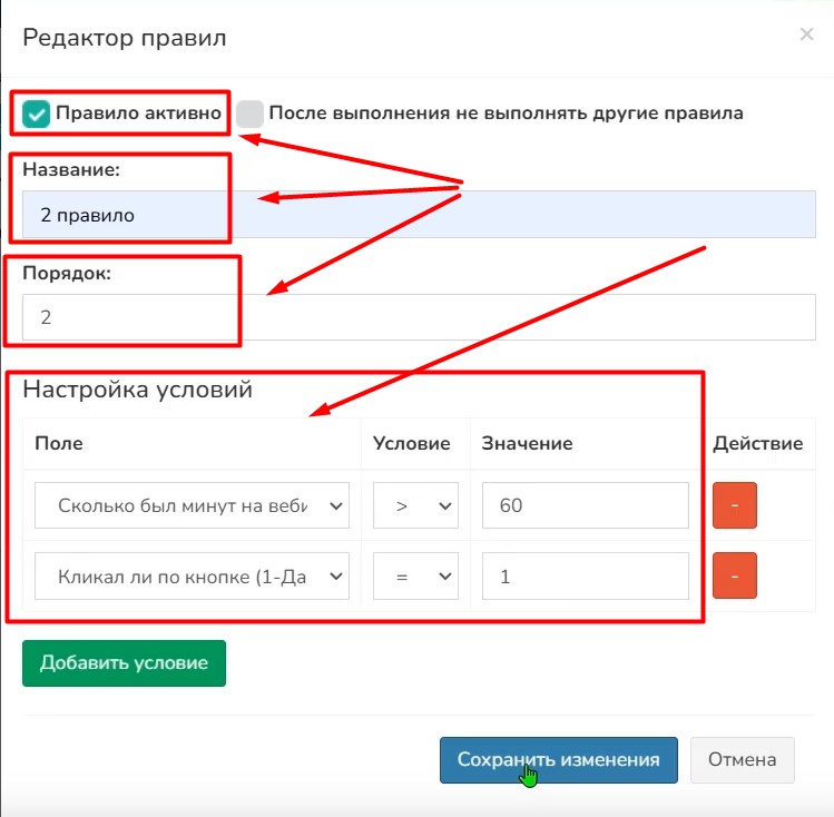 Добавляйте третье и последующие правила в зависимости от активности лидов. Например, «Был > 90 минут» и «Кликнул на баннер».