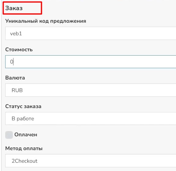 | Оплачен (чекбокс) | Нет | Если включён — к заказу автоматически создаётся платёж |