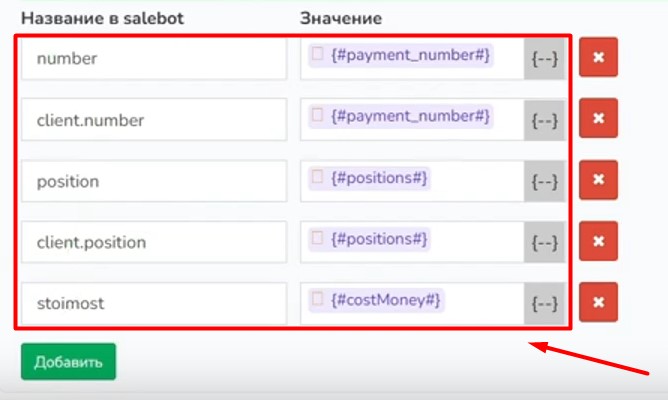 | Название в SaleBot (левая колонка) | Название переменной. Для записи в профиль — с префиксом client. (например, client.phone) |