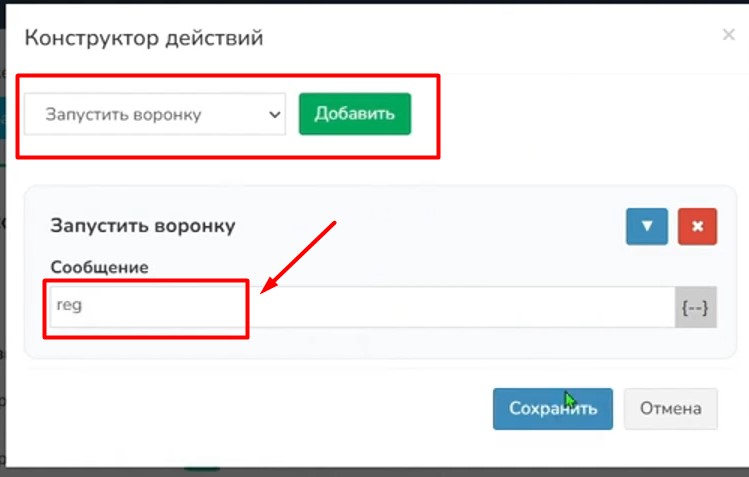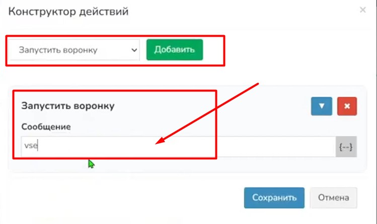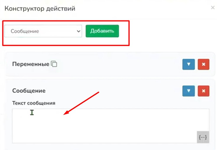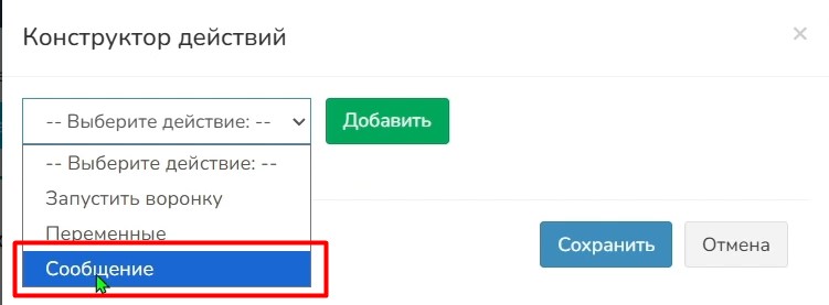 Нажмите «Добавить действие» → Сообщение. Укажите текст: