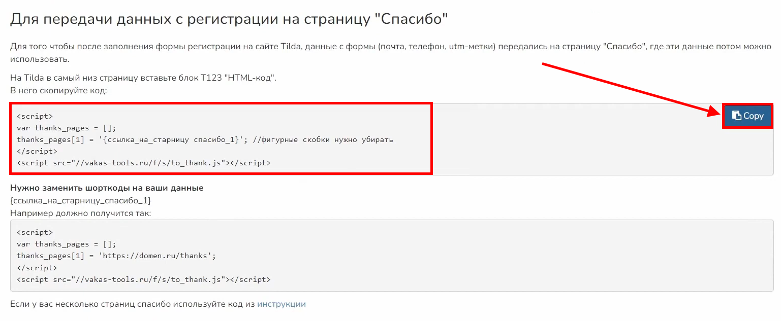 Аналогично вставьте скрипт на саму страницу «Спасибо», чтобы данные передавались в кнопку бота.