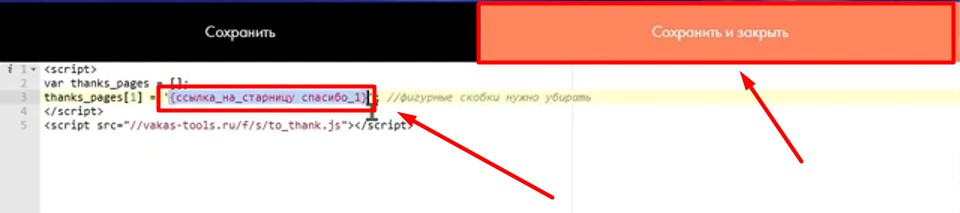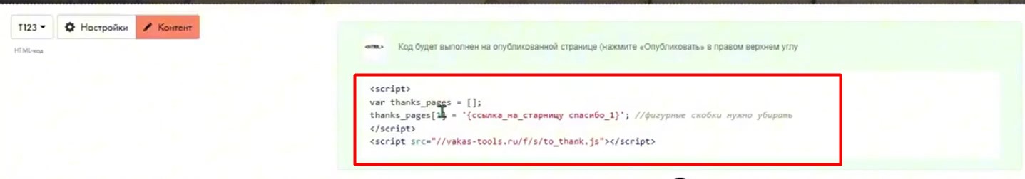 Нажмите на «Контент». Вставьте скопированный скрипт. Внутри одинарных кавычек вставьте ссылку на страницу «Спасибо».