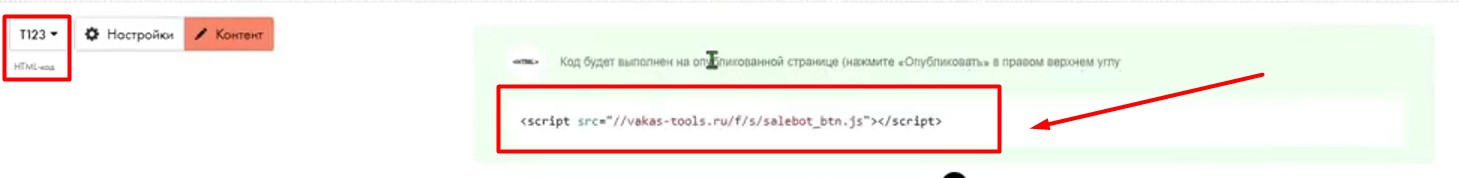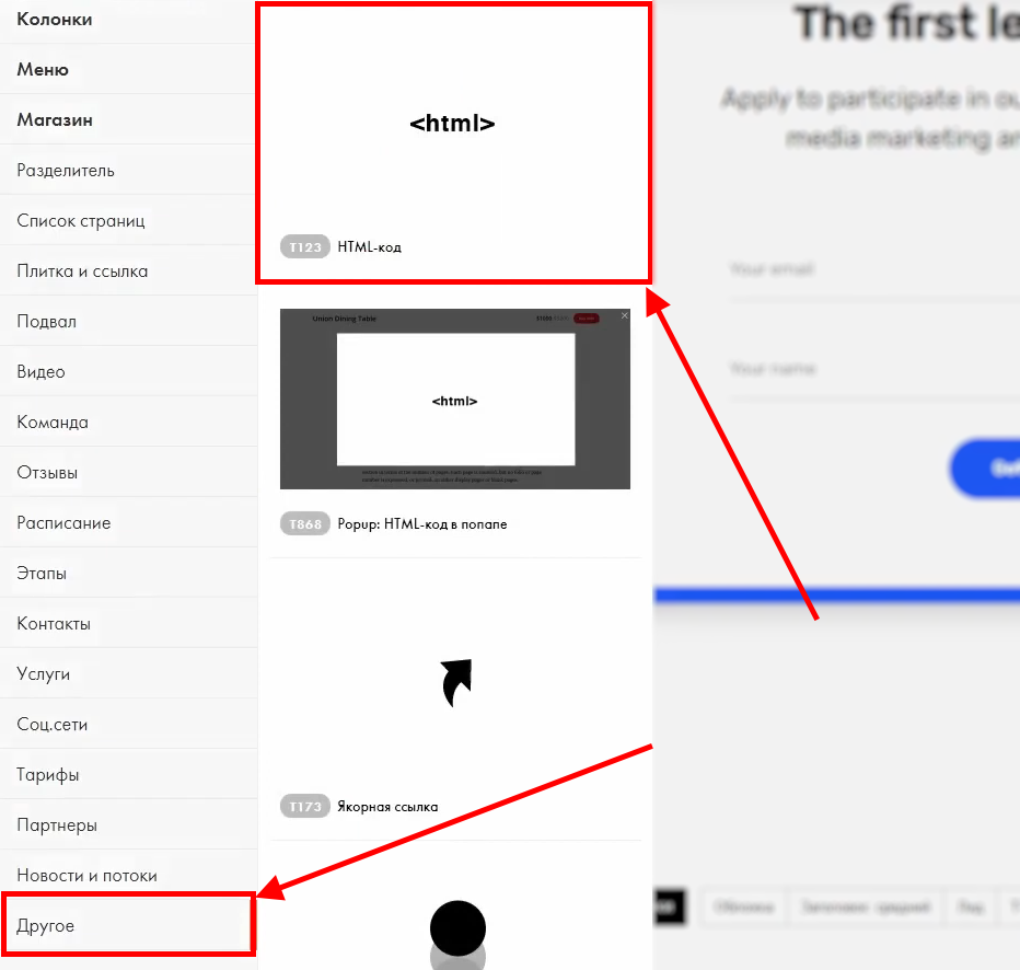 В редакторе страницы нажмите «+ → Другое → T123 HTML code»;