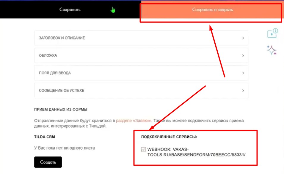 Перейдите на лендинг. Нажмите на «Контент» и найдите вебхук в списке «Подключенные сервисы». Установите галочку и нажмите на «Сохранить и закрыть».