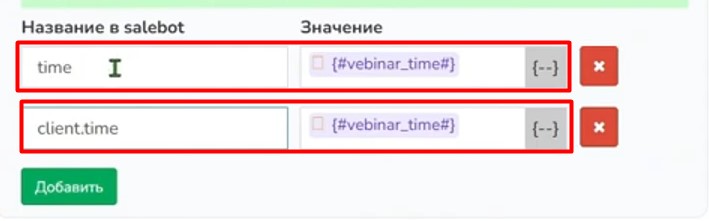 - Передавать переменные в профиль клиента и в переменные сделки — дату вебинара, ссылку на комнату, статус оплаты и любые другие данные.
