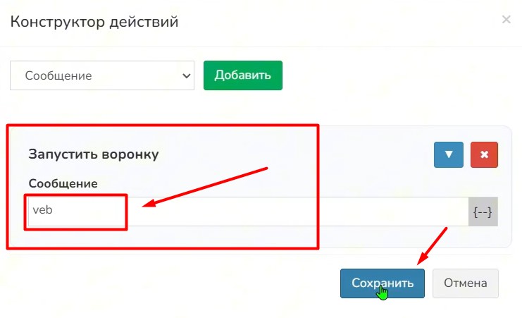| Сообщение | Текст callback — должен совпадать с текстом, настроенным как триггер воронки в SaleBot. Например: /start_webinar. Поддерживает шорткоды. |