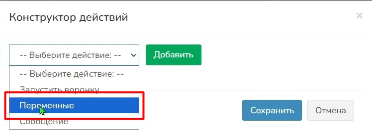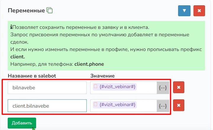Сохраняет переменные в SaleBot. По умолчанию — в переменные сделки. Чтобы записать в профиль клиента — используйте префикс client. перед названием переменной.