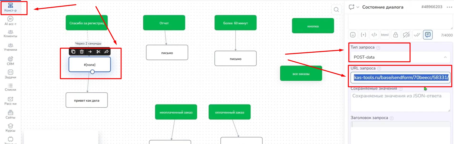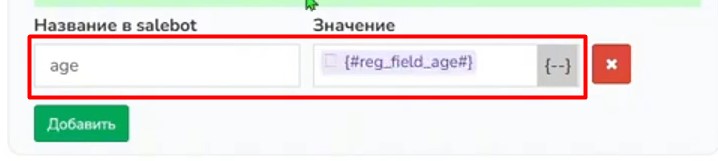 В SaleBot → Конструктор → Блок «Спасибо за регистрацию» добавьте API-запрос: