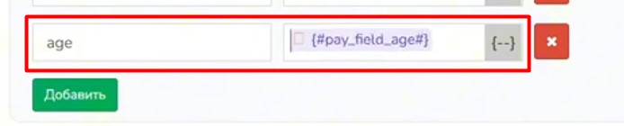 Для произвольных полей (например, возраст) используем шорткод: {#pay_field_Имя переменной#}