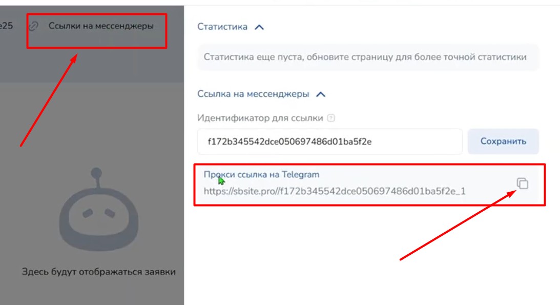 В SaleBot → Ссылки → Мессенджеры скопируйте ссылку на Telegram-бота.