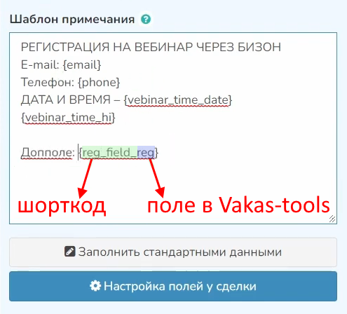 Если необходимо передать из Getcourse в Vakas-tools не поля, которые уже указаны в вебхуке, а дополнительные данные для их последующей передачи в другой сервис, например, amoCRM или Bitrix24.