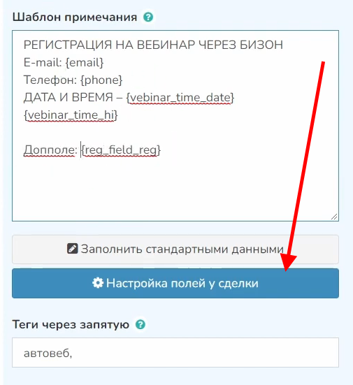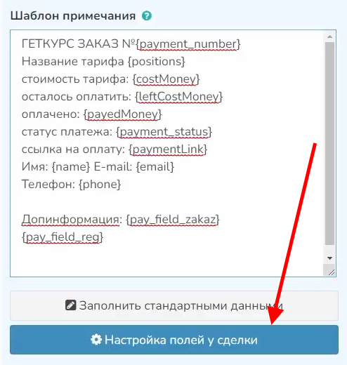 1 Для передачи данных в поля сделки нажмите на «Настройка полей у сделки»