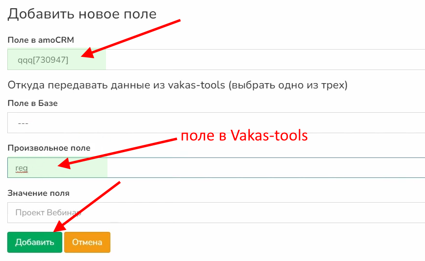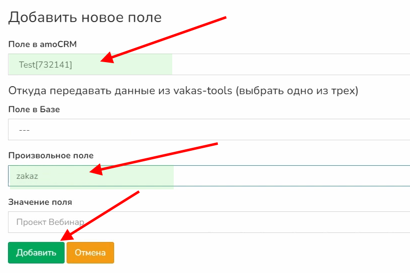 4 Выберите, откуда будут передаваться данные из Vakas-tools. Укажите наименование поля в Vakas-tools в «Произвольное поле». Нажмите на «Добавить»
