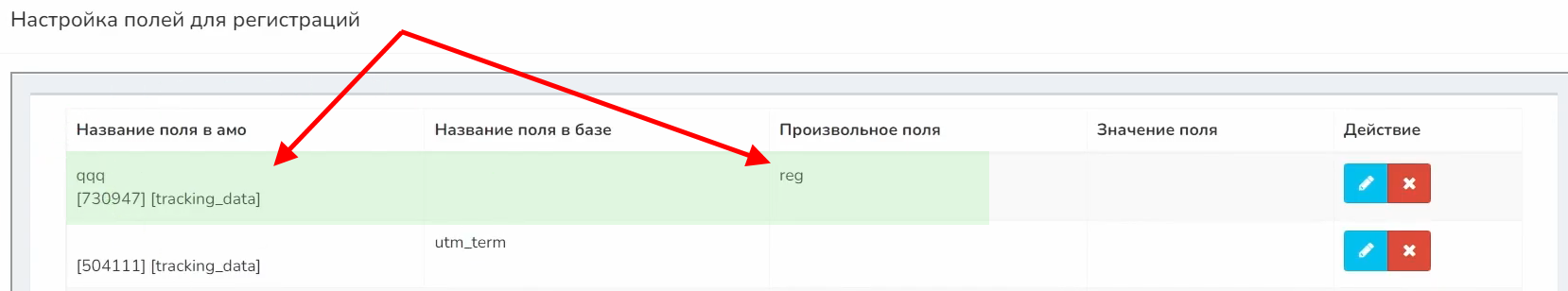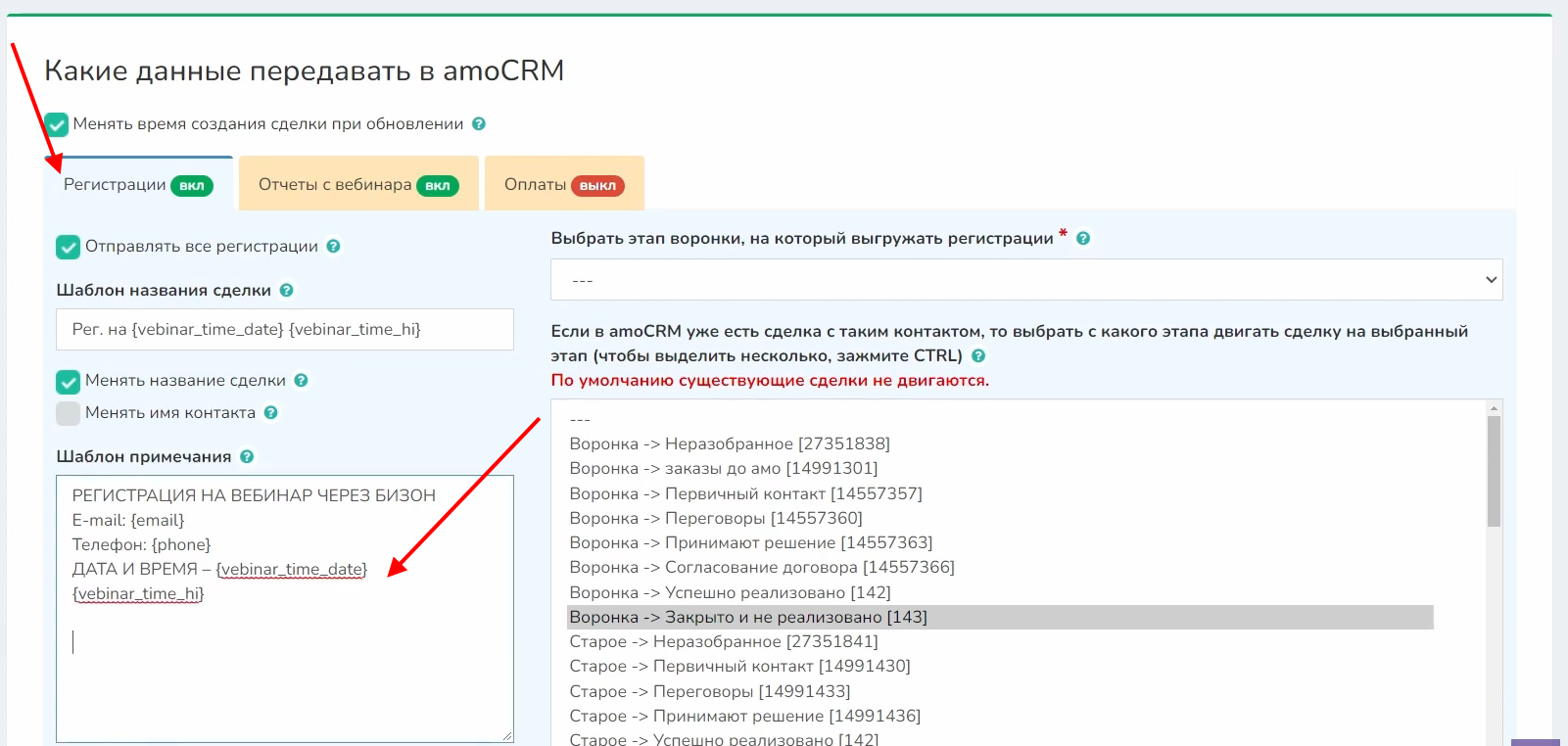8 Выберите вкладку «Регистрации». Данные можно передать в «Примечание» и в «Поля у сделки»