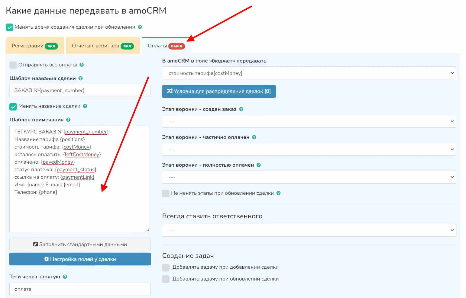 6 Выберите вкладку «Оплаты». Данные можно передать в «Примечание» и в «Поля у сделки»