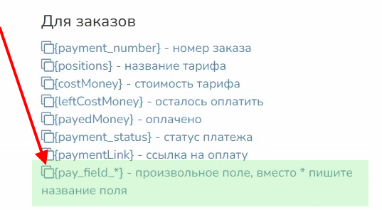 7 Чтобы добавить дополнительное поле в шаблон примечания, воспользуйтесь шорткодом {pay_field_*} из раздела «Для заказов»