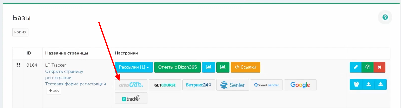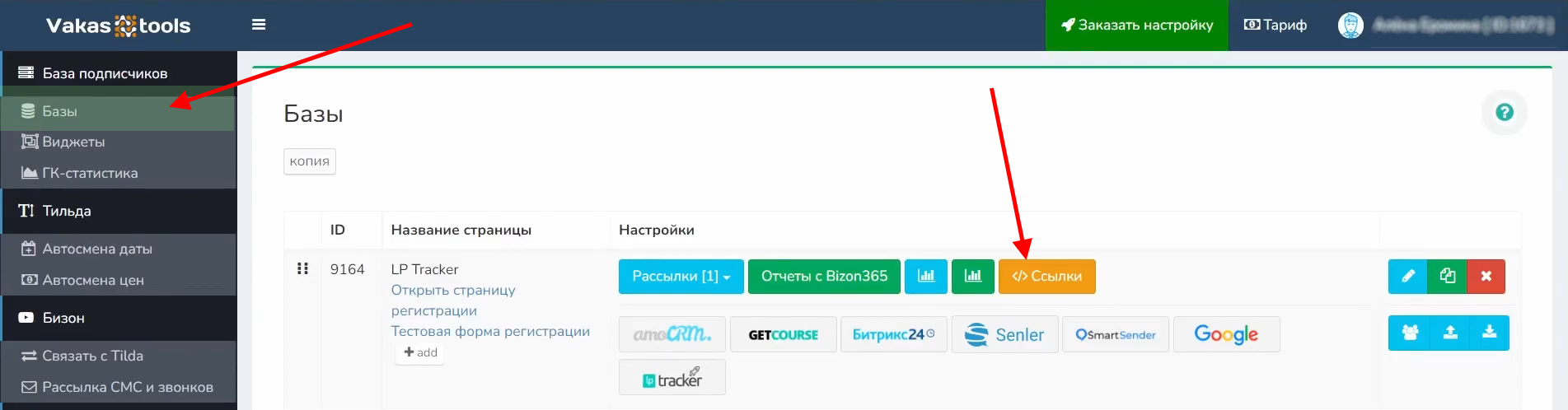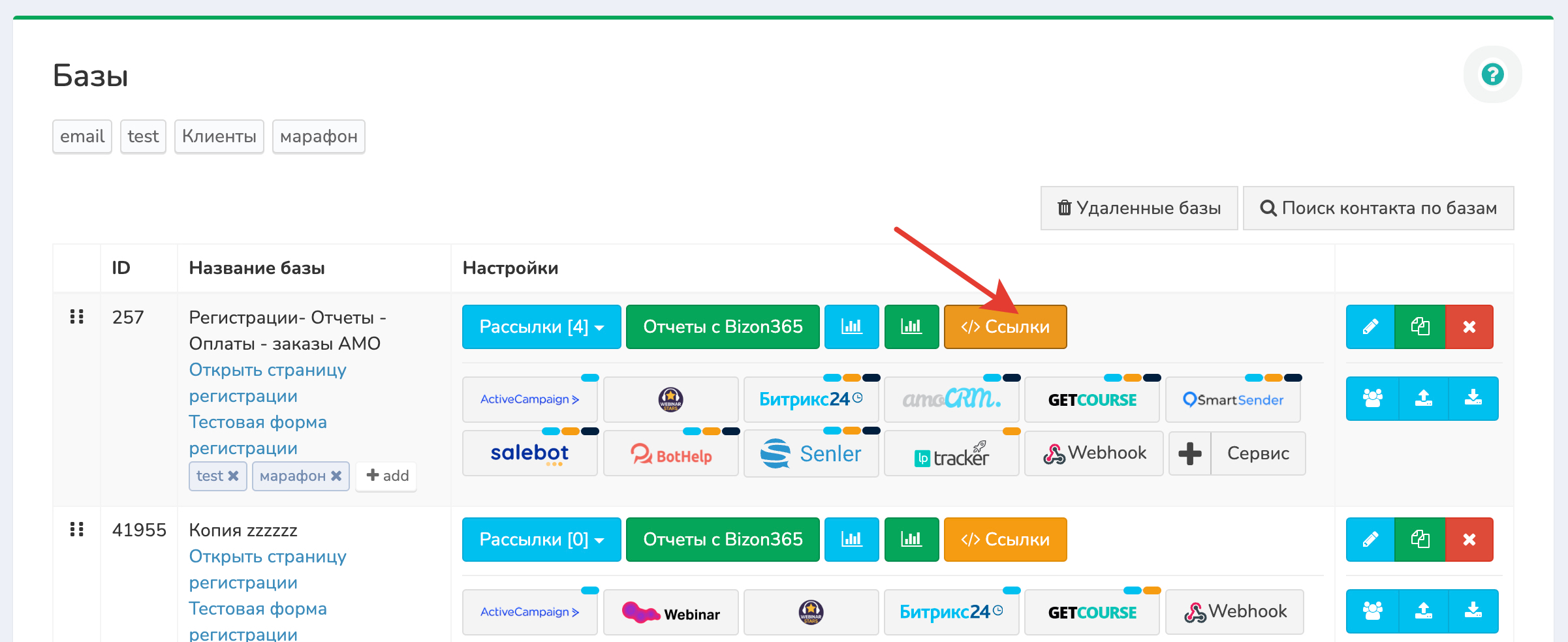 1 В Vakas-tools в меню слева выберите «Базы». В базе, через которую будут проходить регистрации, нажмите на «Ссылки»