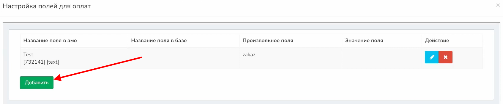 2 В окне «Настройка полей для оплат» нажмите на «Добавить»
