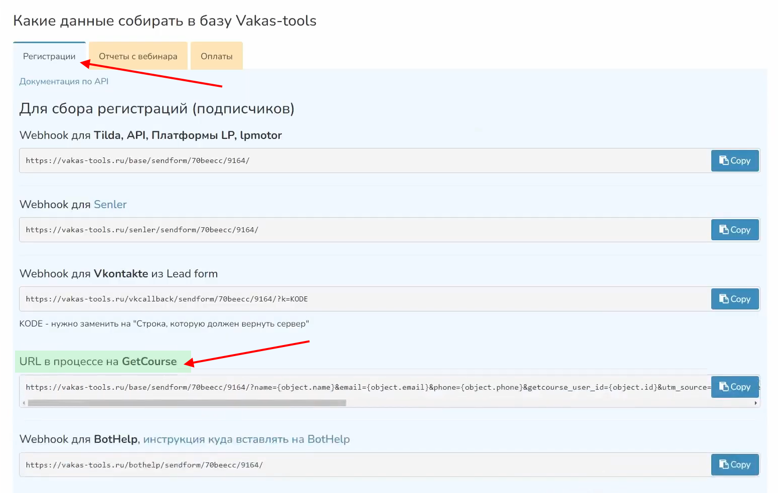 2 Во вкладке Регистрации, Отчеты или Оплаты спускаетесь до передачи в GetCourse и переходите по ссылке «генератор вебхука»