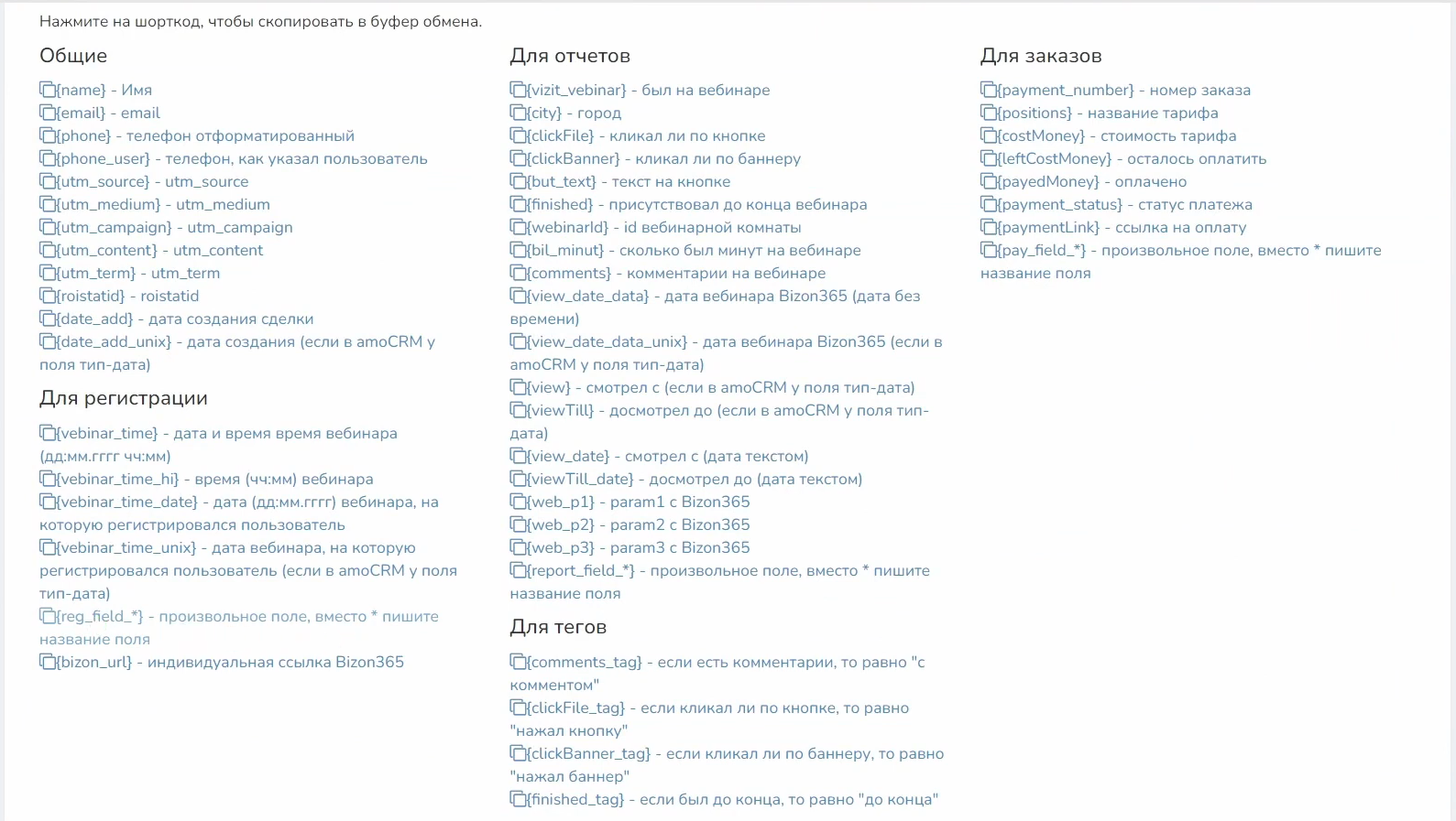 Шорткоды расположены на странице настроек сервиса ниже. Есть общие шорткоды, шорткоды для регистрации, отчетов, заказов и тегов. Чтобы скопировать шорткод, нужно на него нажать.