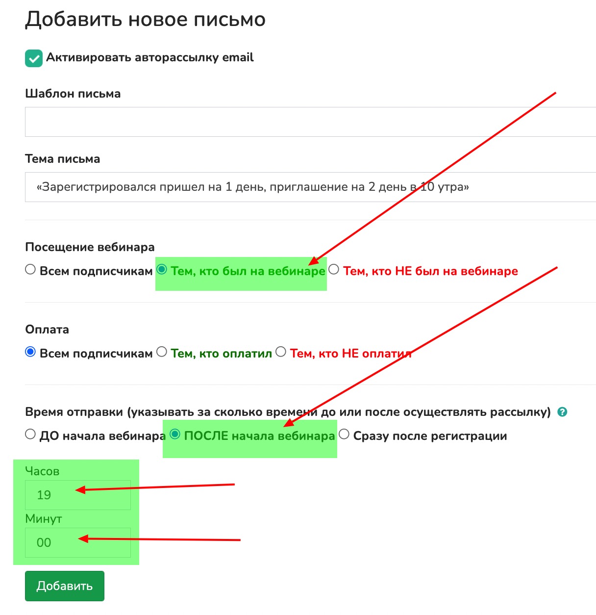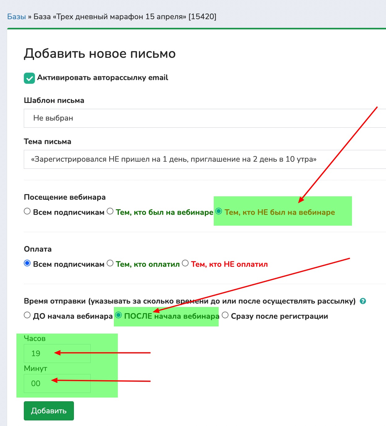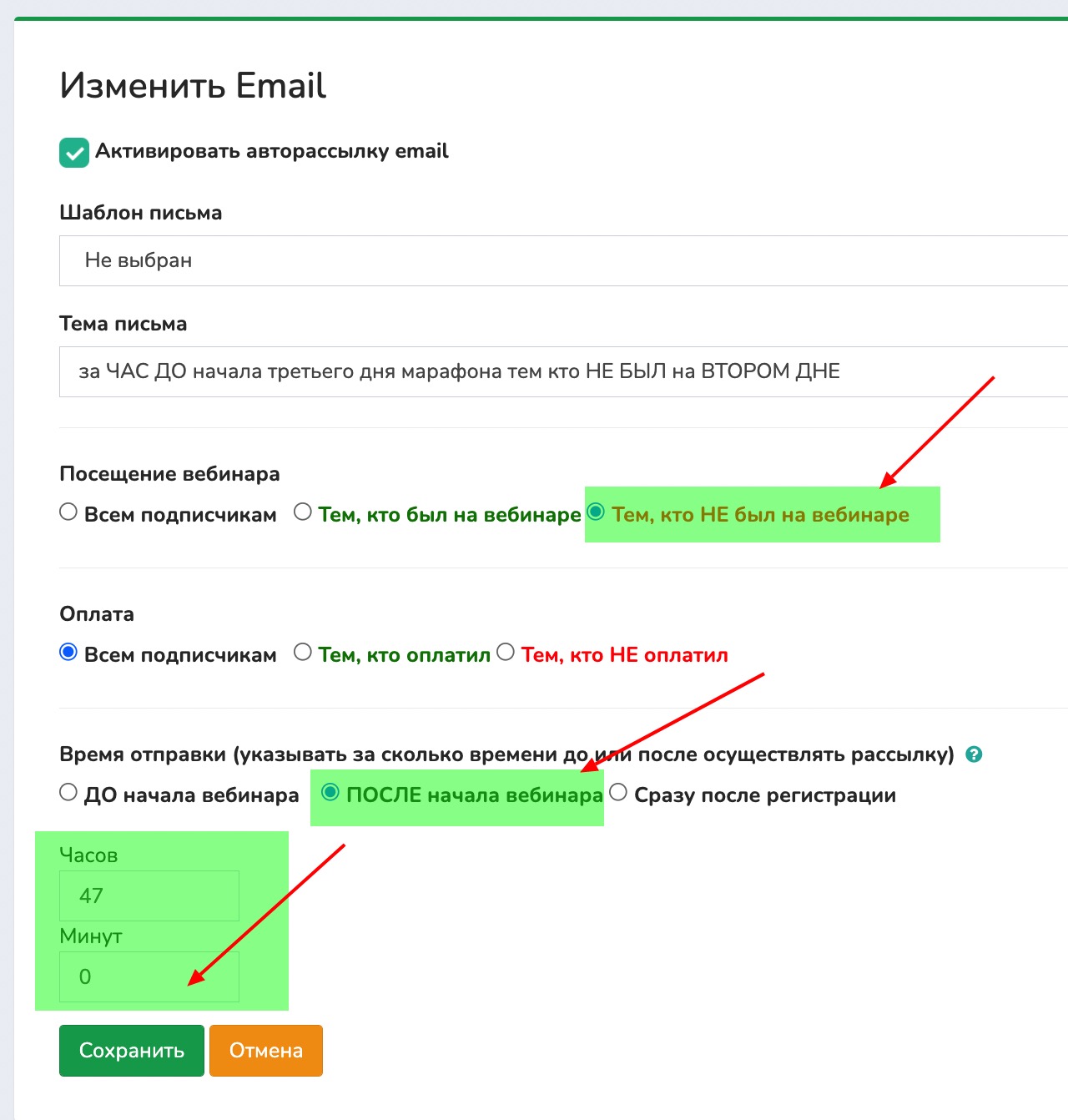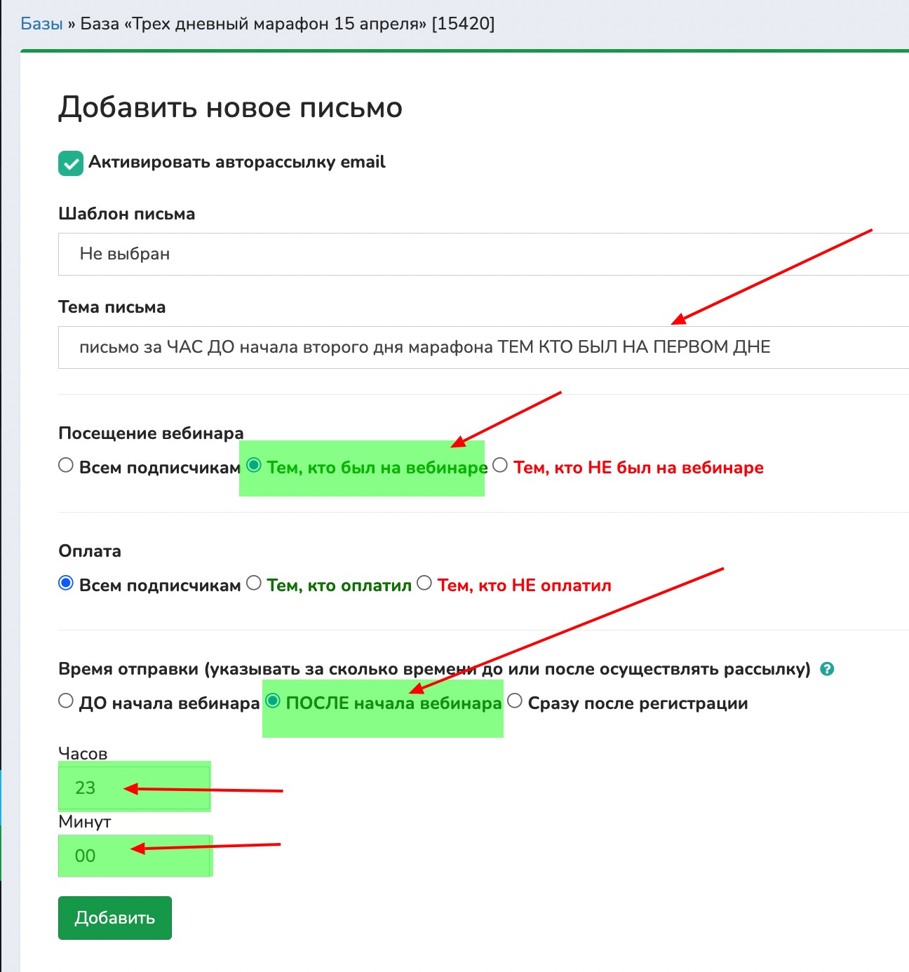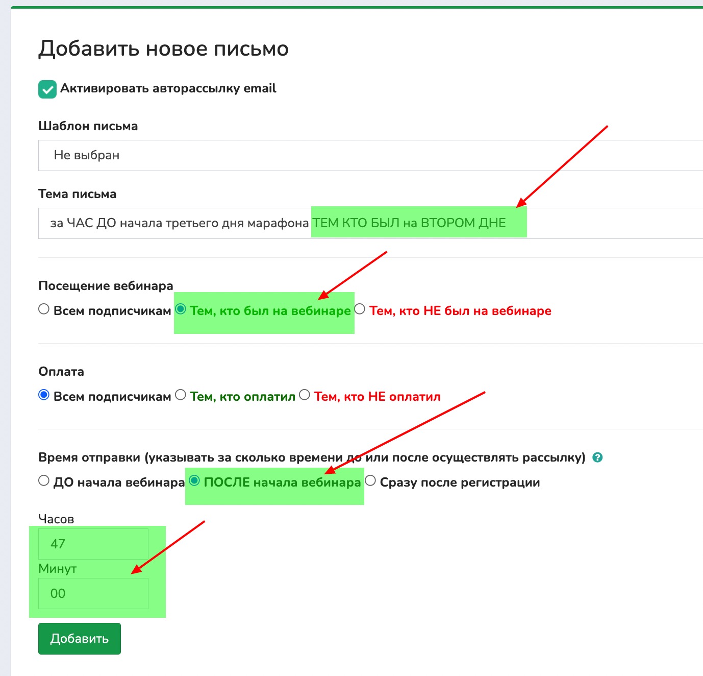 Если вы планируете проводить трехдневный марафон, или хотите увеличить время «дожима» По тем кто зарегистрировался на вебинар или марафон, вы можете запланировать серию рассылок вперед на 3 дня и более.