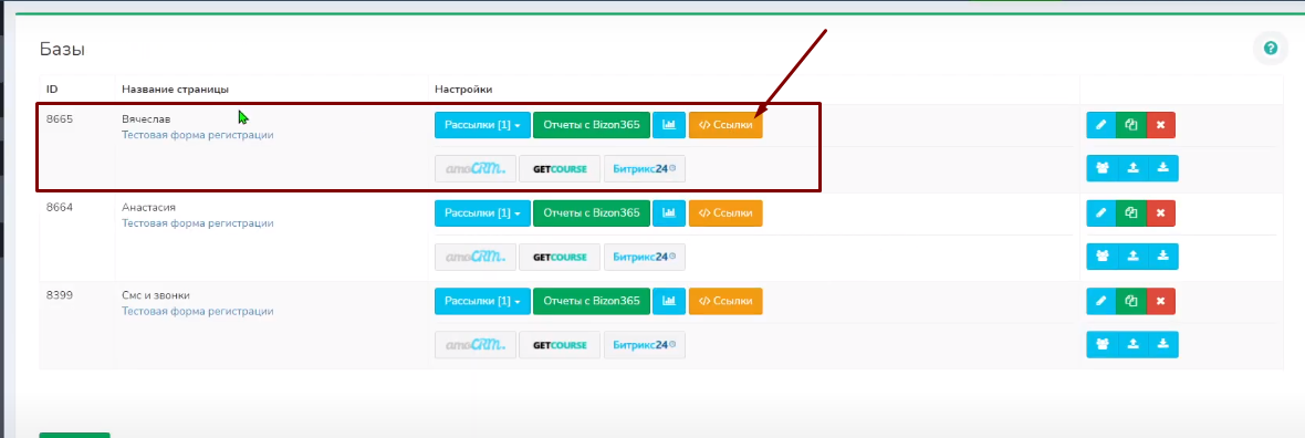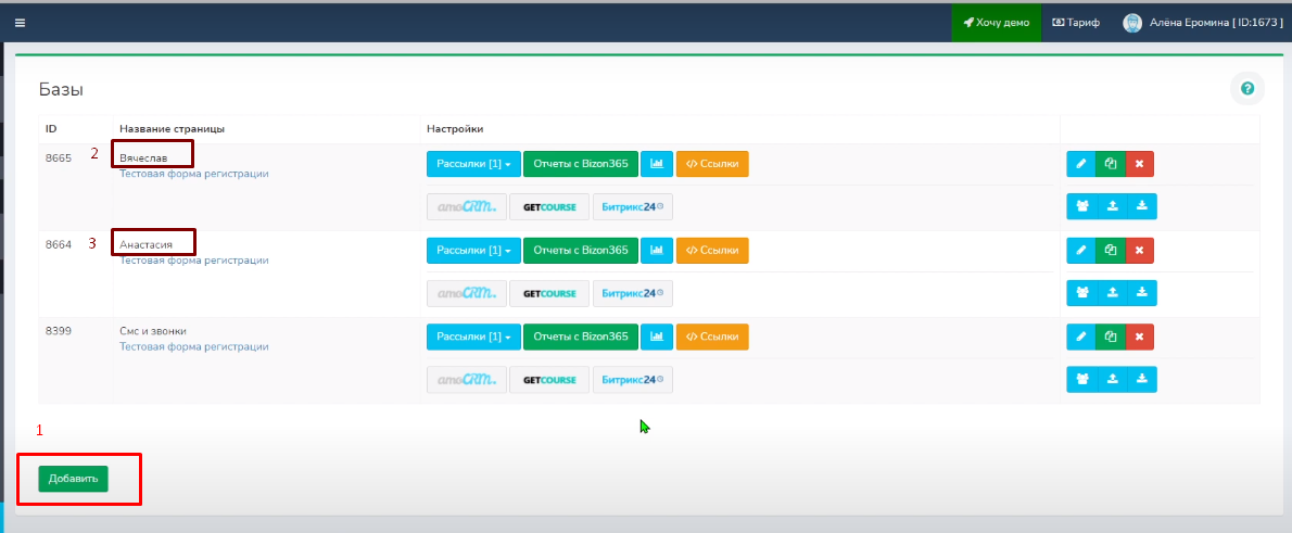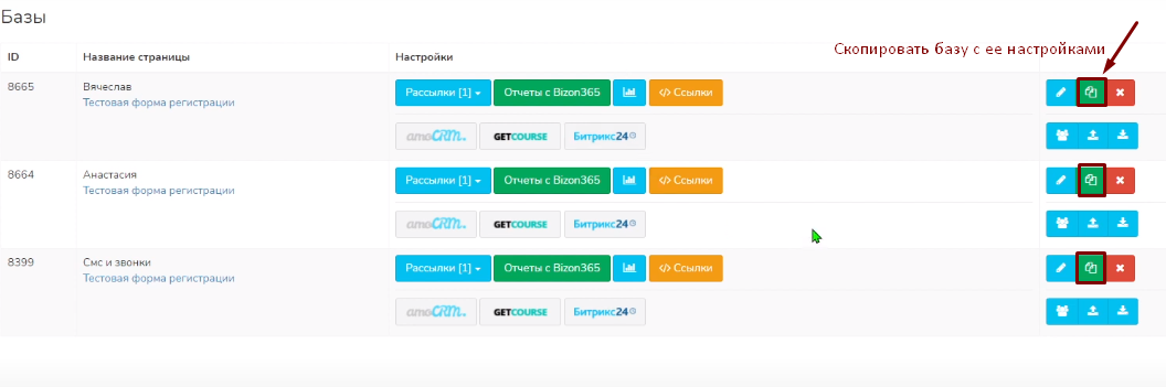 Чтобы ускорить процесс вы можете создать первую Базу, настроить ее, а затем скопировать столько сколько у вас будет менеджеров, настройки Базы копируются вместе с базой. Чтобы скопировать, нужно просто нажать на кнопку [Копировать] (2 листочка справа от базы, на зеленом фоне).
