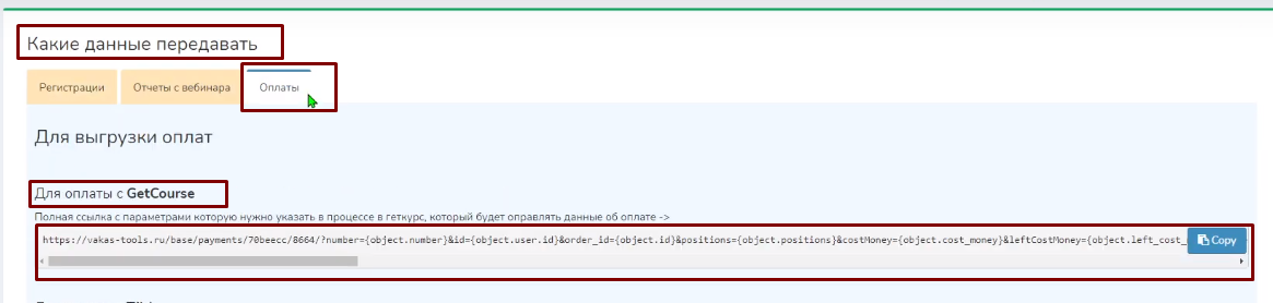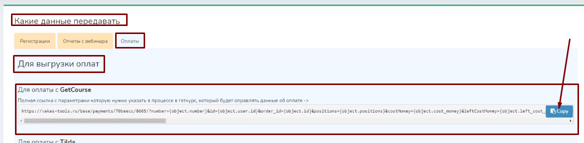 Из этого раздела нужно скопировать ссылку для передачи оплат с GetCourse (можете выделить и скопировать правой кнопкой мыши или нажать на кнопку Copy на голубом фоне).