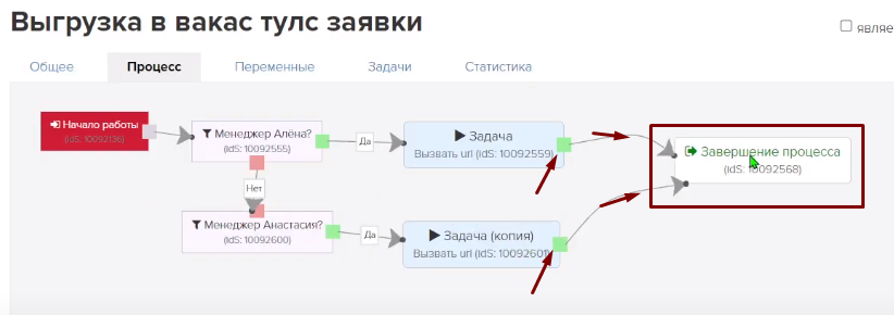 Мы показали на примере трех менеджеров, но у вас их может быть больше, точно также делаете для каждого. Если менеджеров больше, повторяете алгоритм, копируете базу с настройками, добавляете блок Проверка и условия и блок - Операцию вызвать URL в созданный процесс по каждому менеджеру.