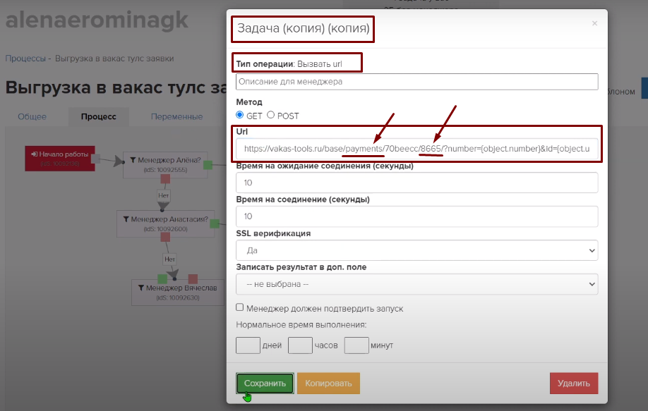 - Операция вызов URL - из этого блока будем отправлять данные по API в базу конкретного менеджера;