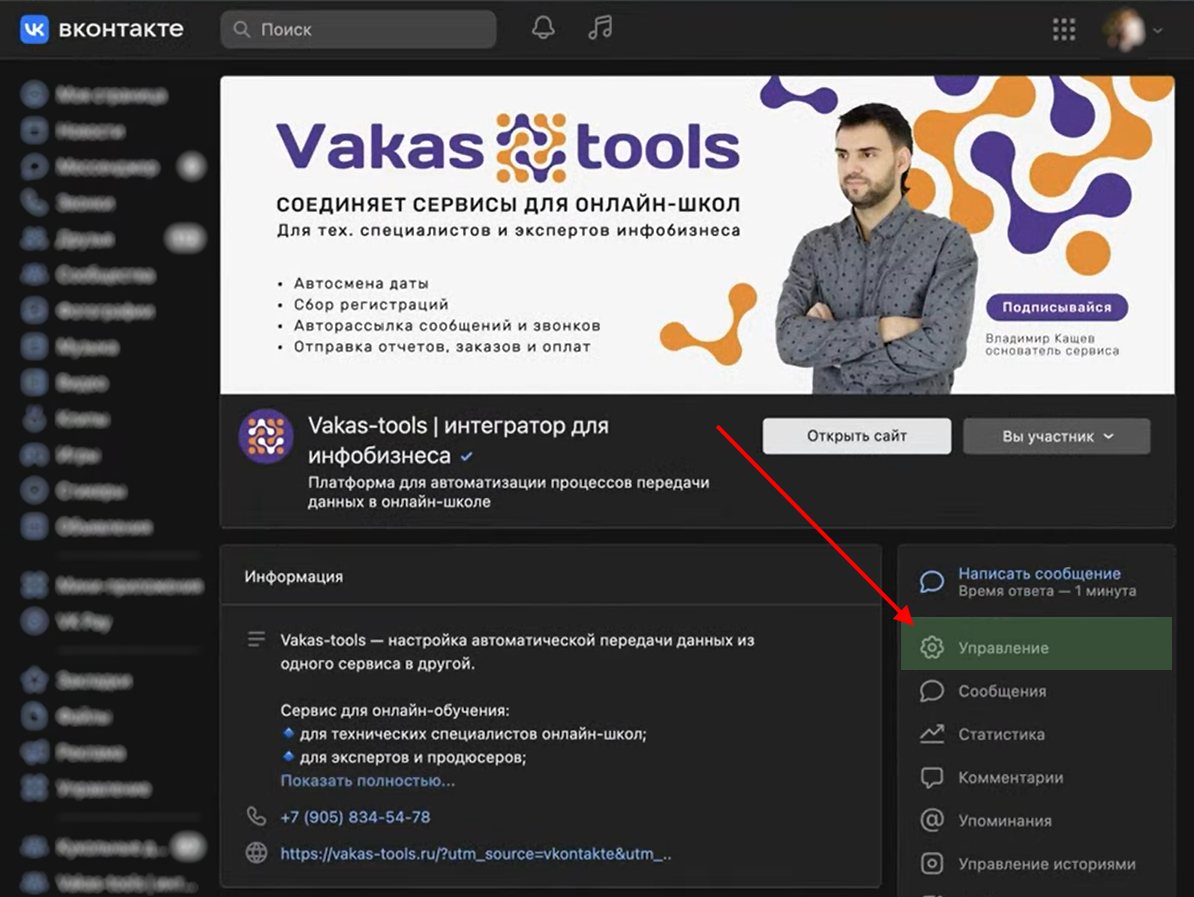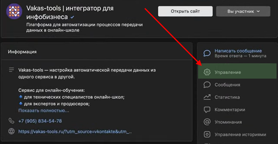 1. В настройках своего сообщества в Вконтакте выберите «Управление».