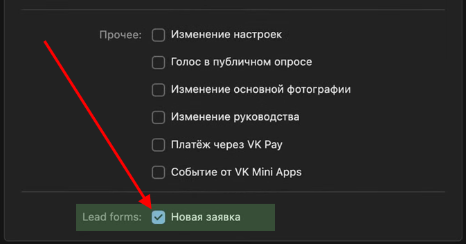 11. Пролистните страницу вниз и поставьте галку напротив «Новая заявка» в разделе «Lead forms».