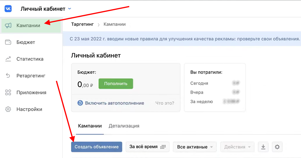 1. Перейдите в рекламный кабинет в раздел «Кампании». Нажмите на «Создать объявление».