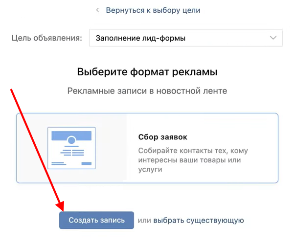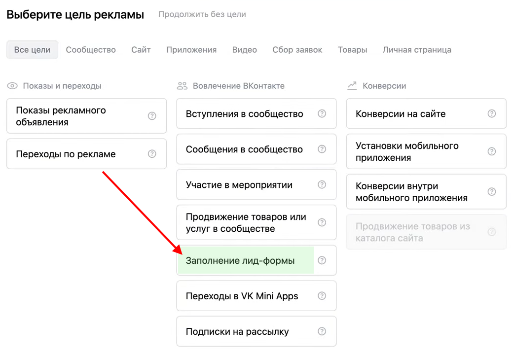 2. Выберите цель рекламы «Заполнение лид-формы».