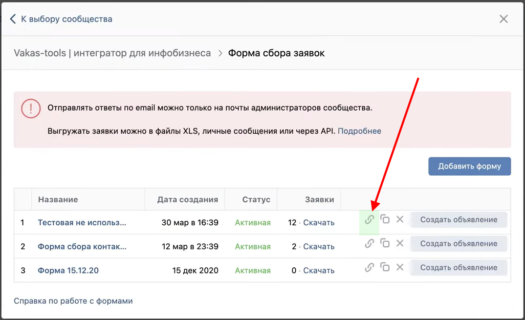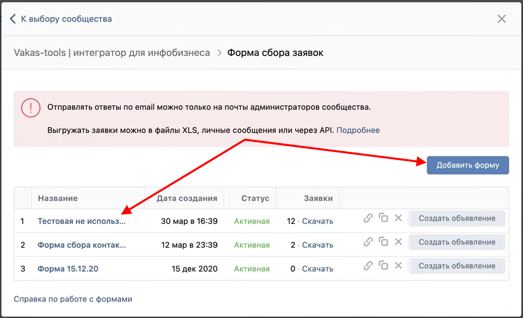 Настраиваем сбор контактов с Лид-формы в Вконтакте и их передачу в Vakas-tools для последующего создания автоматической рассылки СМС, звонков и email-писем.