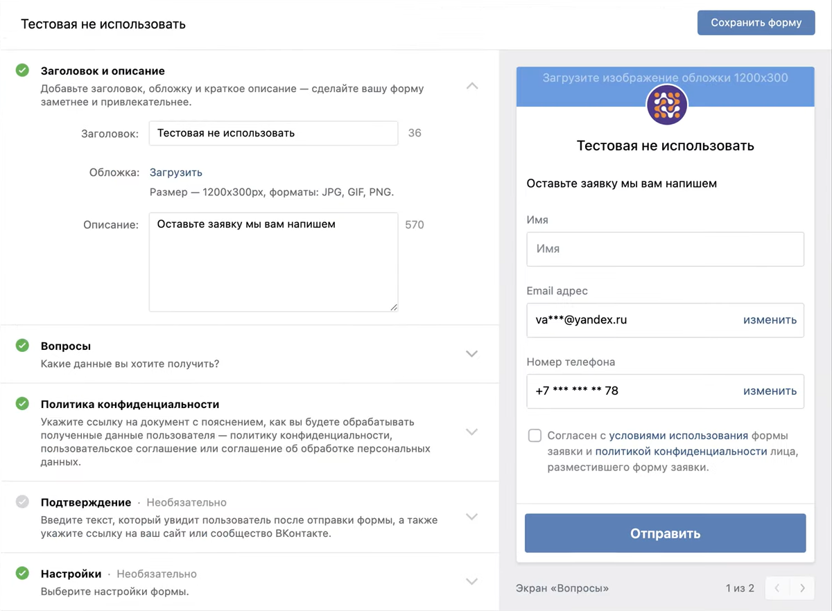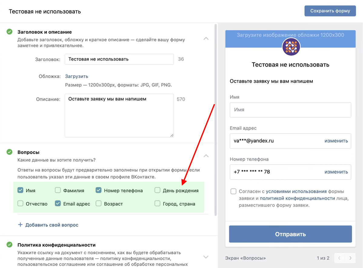 6. В разделе «Вопросы» отметьте, какие данные будут собираться на Лид-форме. Сохраните форму.
