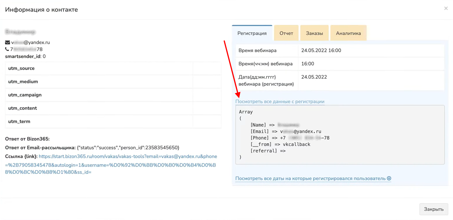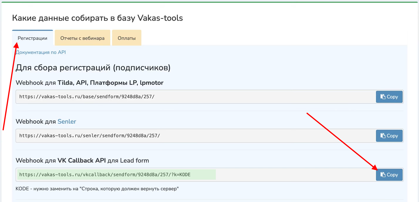 6. Во вкладке «Регистрации» найдите «Webhook для VK Callback API для Lead form». Скопируйте его.