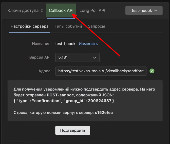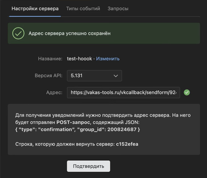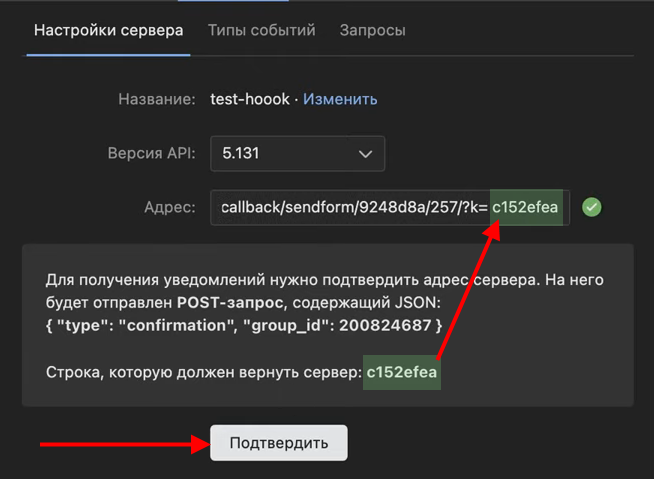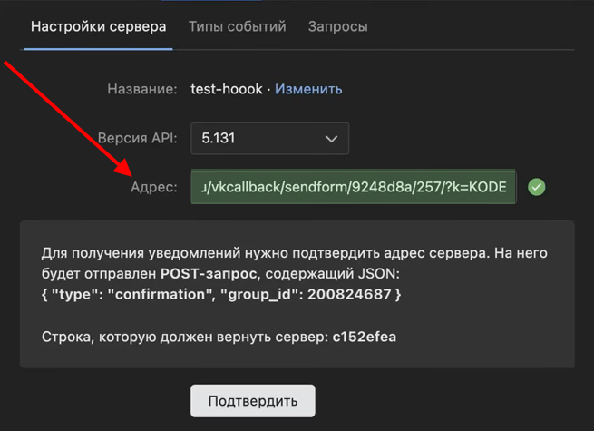 8. Скопируйте строку, который должен вернуть сервер, и вставьте в конец вебхука вместо KODE. Нажмите на «Подтвердить».